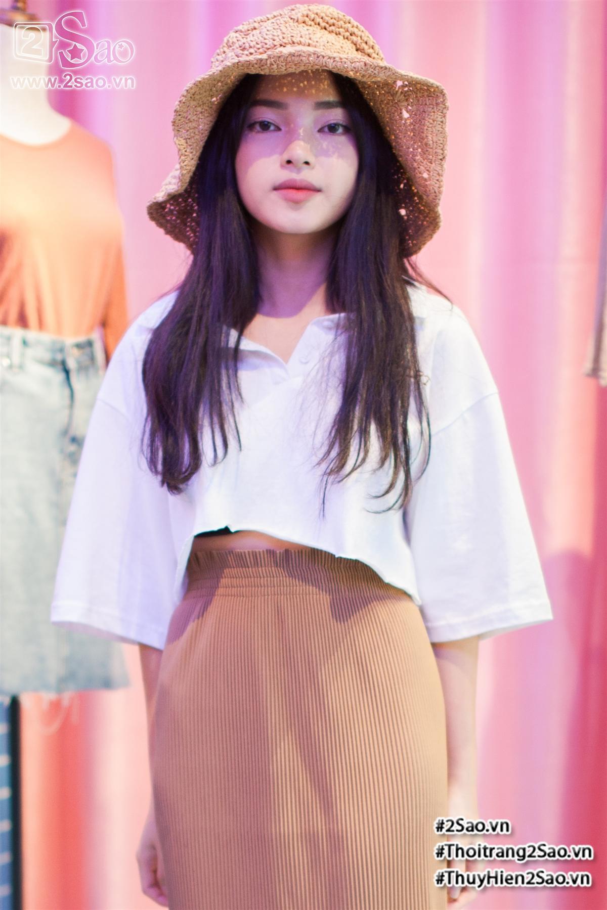 Ngoài chân váy mini juyp thì dù sở hữu chiều cao khiêm tốn, bạn vẫn hoàn toàn mặc được chân váy midi dài nếu biết cách kết hợp khéo léo. Châu Bùi "lên đồ" cực ngọt cho set đồ vintage: áo phông trắng mix chân váy màu camel ton-sur-ton với dép và mũ cói.