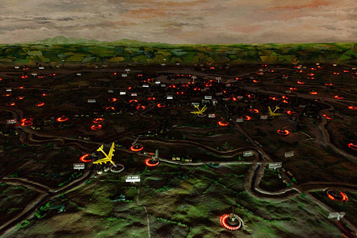 Bước một bước vào căn phòng mới, tôi đã bị choáng ngợp. Căn phòng trông giống như một phòng opera mini với những chiếc ghế dài dành cho khán giả, nhưng đối diện dãy ghế không phải là sân khấu mà là một cái sa bàn khổng lồ trải dài từ sàn đến trần. Sa bàn mô phỏng thành phố Hà Nội và các vùng lân cận trong cuộc chiến. Nào là mô hình súng, tên lửa và máy bay được bày trí rất chi tiết, cùng các đường bay được vẽ chằng chịt trên tường và trần nhà. “Đúng là người Việt mình rất thích sa bàn,” tôi nghĩ.