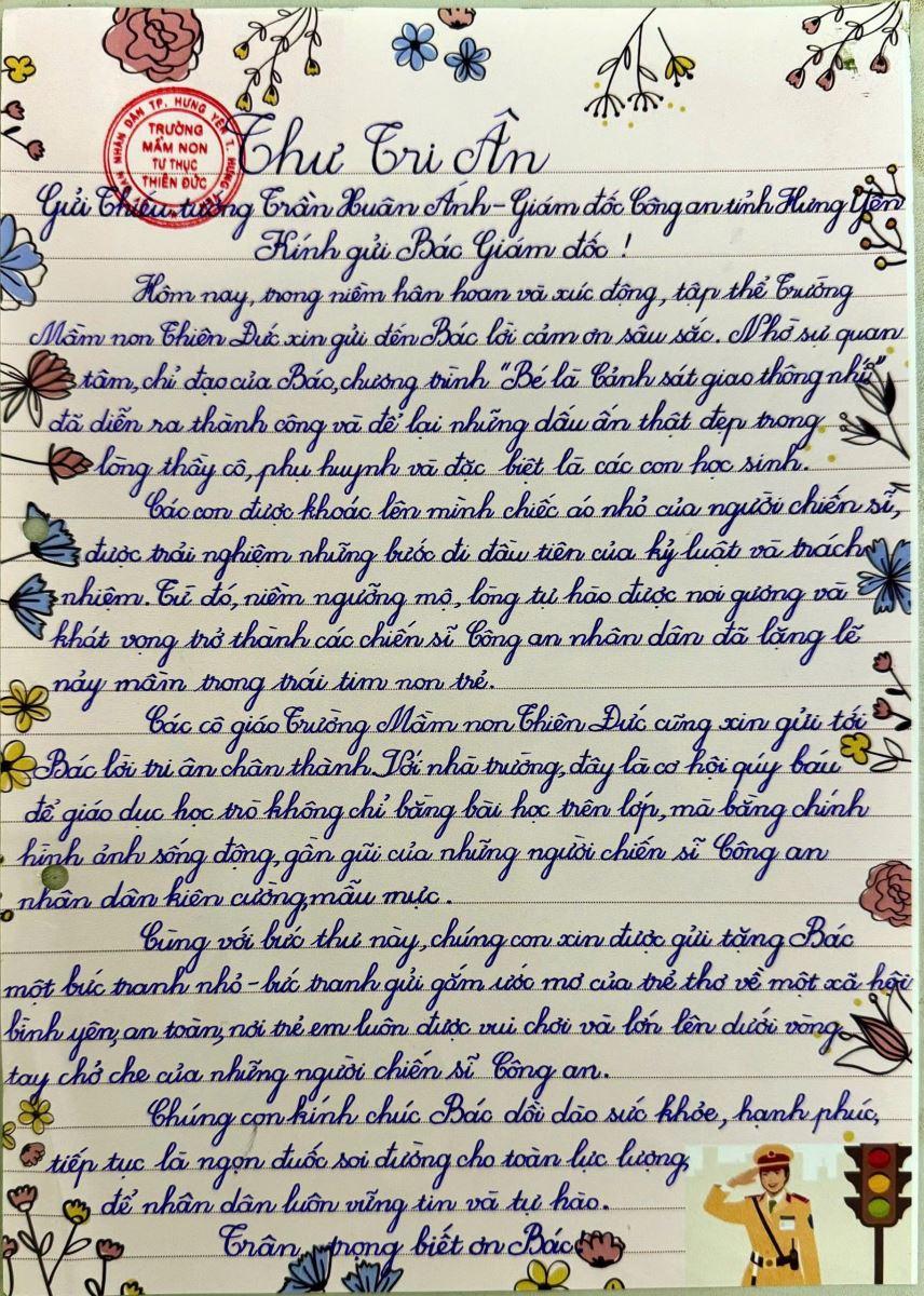Thư tri ân của giáo viên Trường mầm non Thiên Đức, phường Phố Hiến, tỉnh Hưng Yên gửi đến đồng chí Giám đốc Công an tỉnh để cảm ơn về việc đã quan tâm chỉ đạo Phòng Cảnh sát giao thông đã phối hợp, hỗ trợ, giúp đỡ thầy, cô giáo và học sinh Trường mầm non Thiên Đức, tổ chức thành công chương trình “Bé là Cảnh sát giao thông nhí” để lại dấu ấn, hình ảnh đẹp về người chiến sĩ Công an nhân dân trong lòng cán bộ giáo viên, phụ huynh và đặc biệt là các em học sinh. Đây cũng là minh chứng thể hiện tinh thần đổi mới, sáng tạo của lực lượng Công an tỉnh Hưng Yên, góp phần mang lại hiệu quả thiết thực trong thực hiện nhiệm vụ công tác chuyên môn.